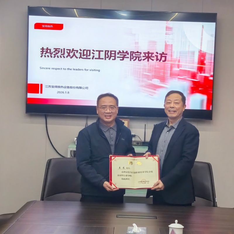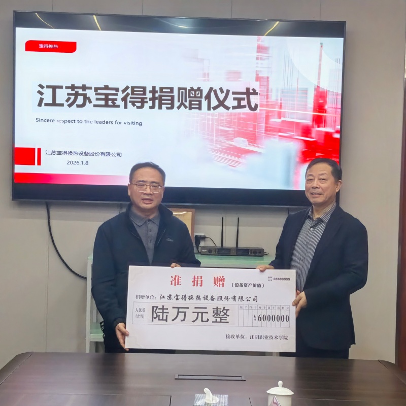 2026年1月8日,江陰職業(yè)技術(shù)學(xué)院與江蘇寶得換熱設(shè)備股份有限公司舉行捐贈(zèng)簽約儀式。此次儀式標(biāo)志著雙方在人才培養(yǎng)、師資共建、設(shè)備支持等方面的合作進(jìn)入新階段。